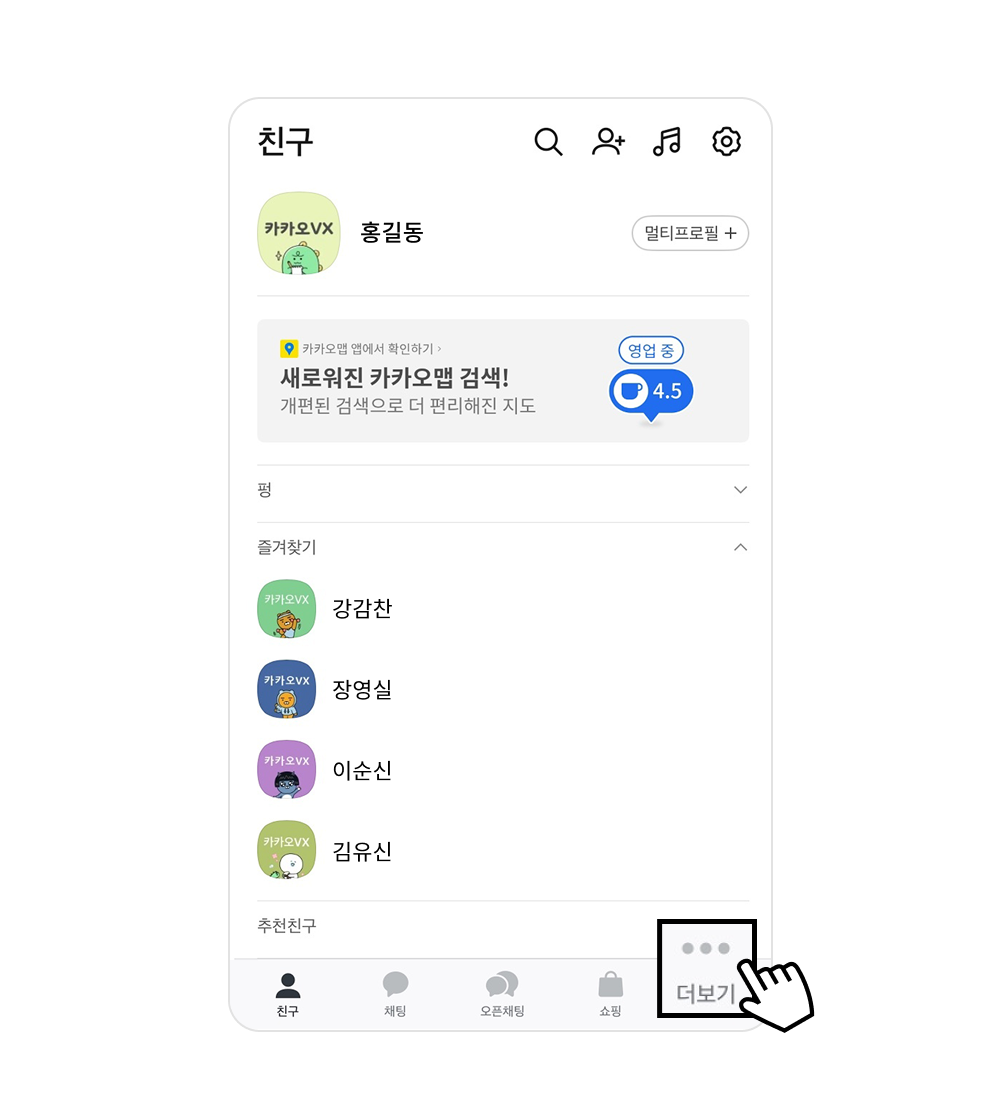 1휴대폰에서 카카오톡 앱 실행 후 ‘더보기’ 메뉴 클릭
